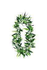 Chain of tropical florets in white color with green leaves strung to make a lei